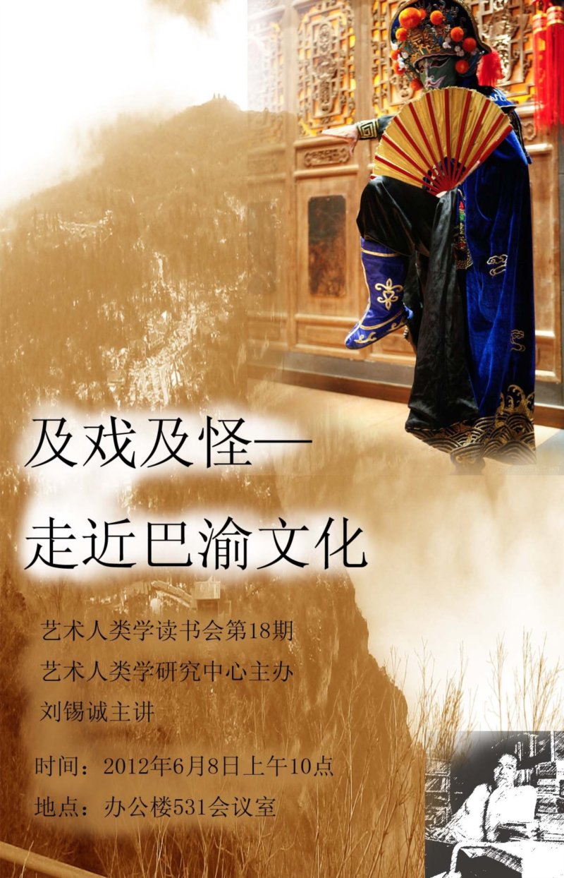 2012年6月8日,著名民间文艺研究专家、非物质文化遗产保护专家、中国艺术研究院艺术人类学研究中心客座研究员刘锡诚先生在艺术人类学读书会上作了题为《及戏及怪,无侵于儒——走进巴渝文化》的专题讲座,艺术人类学研究中心的研究人员、院内外的研究生共二十余人参与了本次读书会。