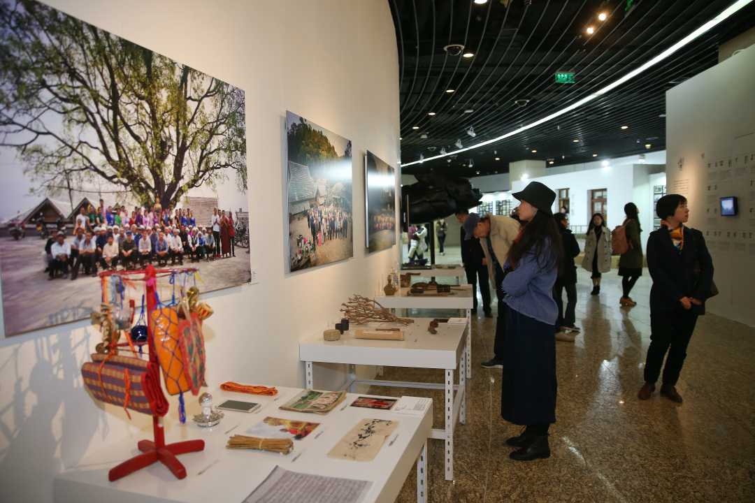 国务院参事室副主任王卫民(前排中)、中国艺术研究院研究员方李莉(前排左)等在展厅参观
