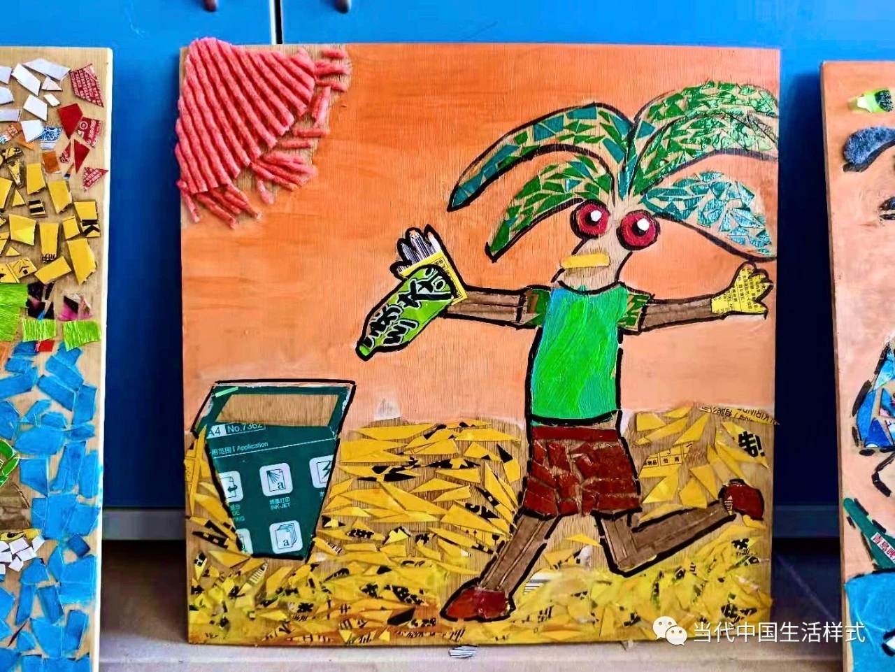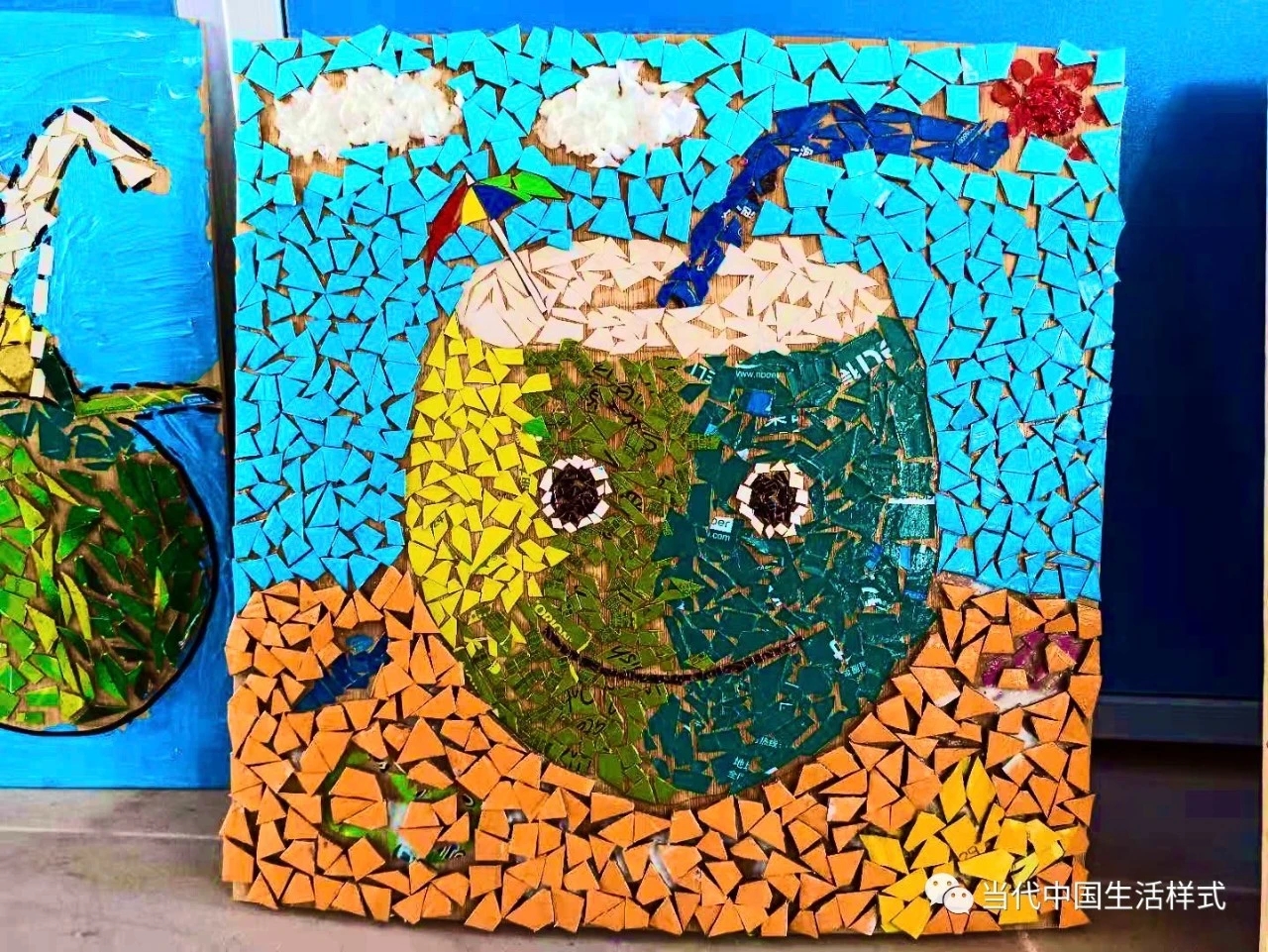 “彩虹计划”是生活样式设计专业委员会与三亚天涯中学合作的一个儿童艺术创作项目,由在天津商业大学艺术学院副教授范佳指导天涯中学的学生完成。该项目,将各色废弃海洋垃圾归类为彩虹七色,再加工成马赛克大小的碎片。随后,将这些碎片当作调色盘里的“颜料”,创作成拼贴画。创作过程得到了天涯中学老师的积极支持,同学们脑洞大开,创作出了20余幅以环保为主题,色彩绚丽、极富想象力的作品。