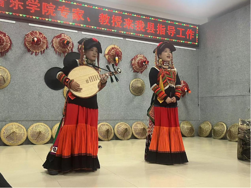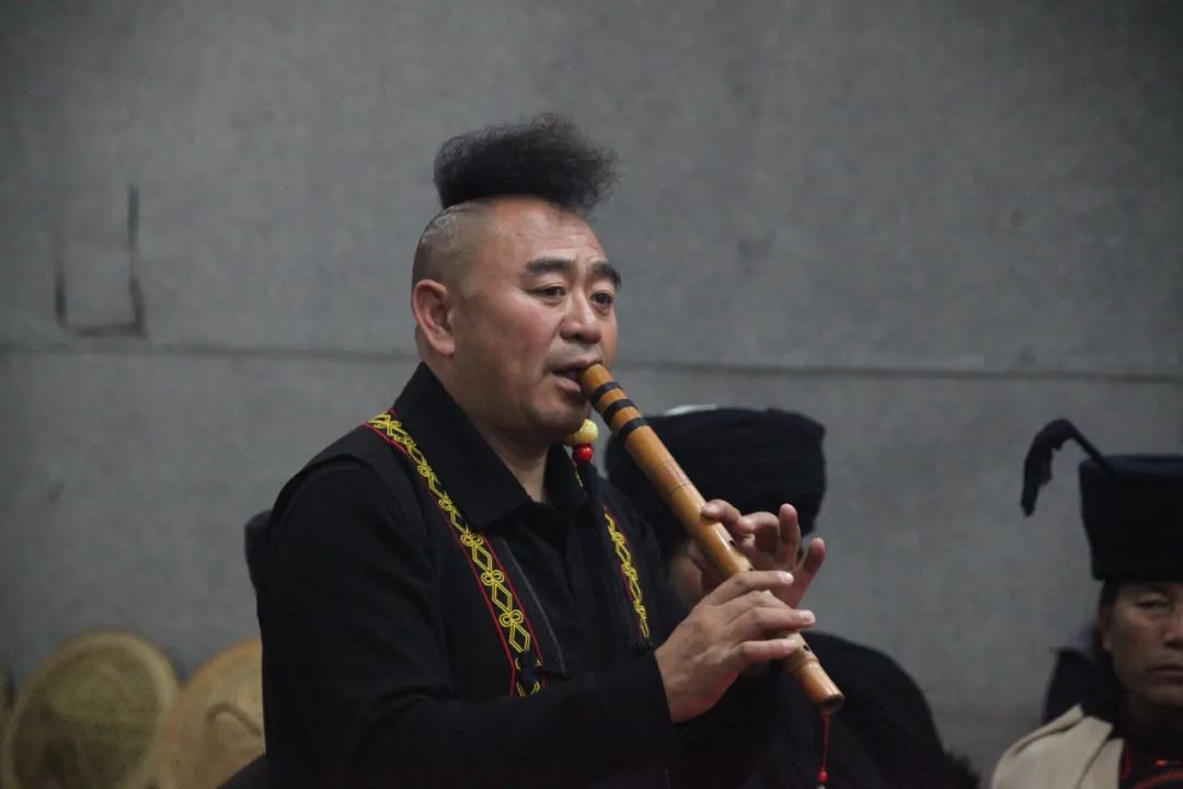 时间来到傍晚,一场精彩纷呈的展演活动拉开帷幕,文化馆的工作人员阿铁说日老师特意邀请到彝族毕摩音乐的国家级非物质遗产传承人。口弦、马布、月琴,毕摩,克智等多位传承人纷纷登场,让大家听到了独特而绝妙的彝音盛宴。他们熟练地展示着各种乐器的独特技法,悠扬的旋律、多变的音高,仿佛在诉说彝族古老的故事。工作坊师生近距离地感受着彝族文化的独特魅力,这不仅是一场视听盛宴,更是一次深入了解彝族艺术文化的绝佳机会,为此次田野调查实践增添了浓墨重彩的一笔。