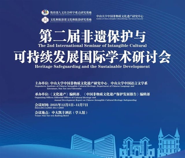 2025年12月5日至7日,由中山大学中国非物质文化遗产研究中心、中山大学中国语言文学系主办,《文化遗产》编辑部、《中国非物质文化遗产保护发展报告》编辑部承办的第二届“非物质文化遗产保护与可持续发展”国际学术研讨会在中山大学顺利举行。本次会议邀请了90余位来自50余家国内外高校、科研机构及非遗保护单位的学者参会,其研究涵盖非物质文化遗产的传承、保护、管理及开发应用等领域。