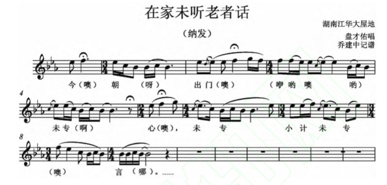 当下,主要有贵州学者张中笑、中央民族大学赵毅先生涉及对“族性歌腔”的分析研究。如赵毅认为,“所谓歌腔(民歌音调)不一定指一个完整的音乐曲调,往往只是一个引子,一声呼喊,一句衬词或某种特性,便是这个音调的风格所在,通过某个典型特征的音乐素材,即可将一个民族的个性、民族的精神气质呈现出来。”他还认为,“关于民歌音调(歌腔)的形成,当与民族的传统风俗习惯和生产生活方式有关,与当地的自然条件和地理环境,尤其与民族语言密切相关。”笔者认为,“族性歌腔”就是一个族群文化发展历史特征的浓缩,它彰显某一个族群的生活习俗、社会历史发展概况、民俗信仰、语言风俗习惯等等历史记忆符码的浓缩与精华。尤其是具有鲜明特征的“歌腔”音声符号是与某个族群的风俗习惯、语言特征、民俗信仰、族群发展历史等等诸多文化事象密切相关。据笔者调查发现,在湘、粤、桂交界处的过山瑶支系音乐中普遍具有“族性歌腔”的特征。如瑶族“还家愿”(歌娘唱)与婚俗仪式(“坐歌堂”)中的“纳发调”。“族性歌腔”不但是旋律声腔的共性特质,同时也是某区域音乐(音调)认同的彰显。它的形成与建构不但受到族群语言风格因素的影响,也与其族群的发展历史、民俗生活习惯、生存地理文化环境,以及与周边族群文化的互动与交流密切相关。