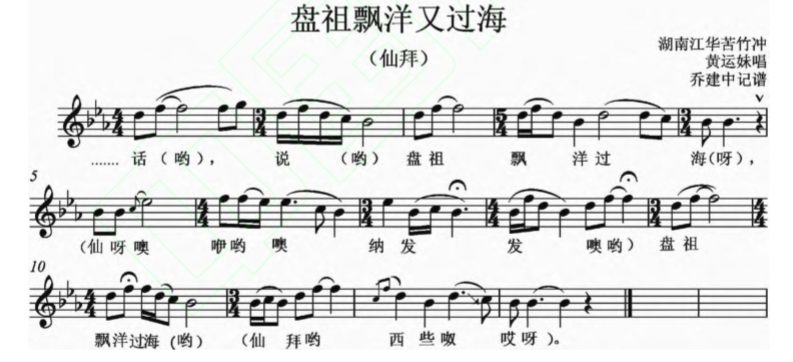 其次,过山瑶“族性歌腔”哀婉悲凉的旋律音调倾诉了其族群“漂洋过海”的心酸历史。彭兆荣认为,瑶族思乡母题盘瓠(盘王)母题或日神犬崇拜母题,漂泊母题、反抗异族压迫母题等等,这些静态母题在动态叙述中不断迭出,表达了瑶族民族自觉意识的倔强要求,以及在同一‘族’(祖先)的认同下,凝聚成一股不屈不挠的勇气和力量的自觉需要。这些母题无形中便成了民族凝聚力的纽带。……‘盘瓤’将是瑶族永恒的叙事母题,甚至它成了民族认同的一种‘尺码’和标志。”“漂洋过海事件重申了瑶族始祖盘王在瑶族中的地位,形成了瑶族祭祀盘王(盘瓠)的统一活动——还盘王愿或过盘王节,成为瑶族传统文化的重要部分。”过山瑶支系中的祖先崇拜(盘王祭祀仪式音声)无论从仪式经文文本还是音声符号的形式化表达双重隐喻了过山瑶支系在“漂洋过海”的历史中祖先盘王对于族群发展的护佑作用的感恩与报答,这种历史记忆与祖先认同在长期的族群发展历史中不断被强化、建构,形成一种具有祖先崇拜与认同特性的盘王祭祀仪式与音乐。