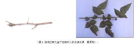 关于独龙族文身的工具,有学者介绍是用竹签[⑧]文刺。笔者所在的中日传统文化比较研究小组中的日方学者桑原稔先生于2006年11月在贡山独龙族怒族自治县独龙江献九当丁拉梅村民俗时采集了标本(图2)。据当地人介绍,独龙族人多用这种带刺的植物作为文身的工具。文身工具分为两个部分:文刺棒和敲击棒。文刺棒长约12~15厘米,文刺棒直径0.3~0.5不等,敲击棒直径1厘米左右。文刺时,把文刺棒对准文刺的部位,用敲击棒轻轻敲击以使刺针入肌肤,见血后点入颜料。