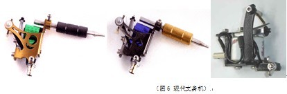 再来看一看近现代的文身工具,更会让人感觉到时代的步伐。1891年世界上第一台电动文身机在美国问世并获得了专利,这在文身领域是具有划时代意义的变革,它为文身走上机械化、自动化的道路开辟了道路。自此以后,文身的发展可说是日新月异,逐渐向小型化、自动化方向发展。20世纪60年代,英国开始使用空心细针文身机,它可以按照图案一次性完成自动文刺花纹和上色两道工序。电动文身机的发明与使用大大推动了文身的发展。如今的电动文身机,一般针头有1针、3针、5针、8针、16针、24针及32针之別,直接利用虹吸管原理吸墨汁进行文刺,极为方便。今天的文身机已经进入了电脑时代,出现了所谓的电脑绘图文身机,即先用电脑绘制要文刺的图案,然后再用机器纹,其准确度更高了。