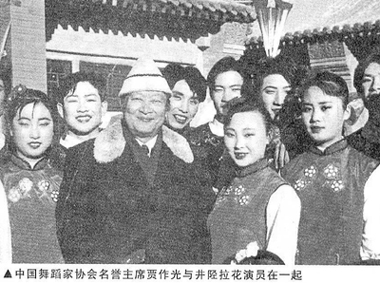 提到井陉拉花,不能不提到一个人——石家庄市舞协原主席、纪念石家庄解放60周年大型电视文献片《60年60人》之一的杨晓泉老师。经过多方打听,笔者终于见到了仰慕已久的老艺术家,他精神抖擞,神采奕奕,满脸的灿烂笑容。 当老人得知我是因拉花而来时,显得更加热情,从屋里拿出一本超厚的《世界舞蹈大辞典》。我小心翼翼地打开,看到了记载拉花的那一页,是杨老师所写。